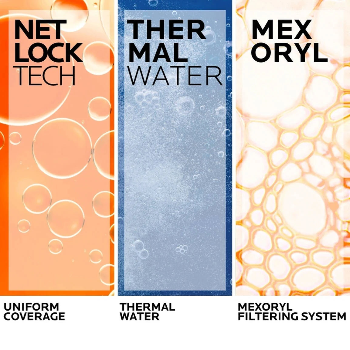 This sunscreen contains Mexoryl XL & SX, an advanced UV filtering system that offers strong protection. It is enriched with Thermal Spring Water to soothe and calm sensitive skin, along with Tocopherol (Vitamin E) for antioxidant defense. Additional ingredients include glycerin, silica, diisopropyl sebacate, alcohol denat., and aqua/water. The full ingredients list is available upon request or on the packaging.
